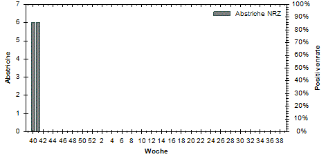 der Sentinelproben mit Erregernachweis (Positivenrate, rechte y-Achse) sowie die Anzahl der an das NRZ eingesandten Sentinelproben (linke y-Achse).
