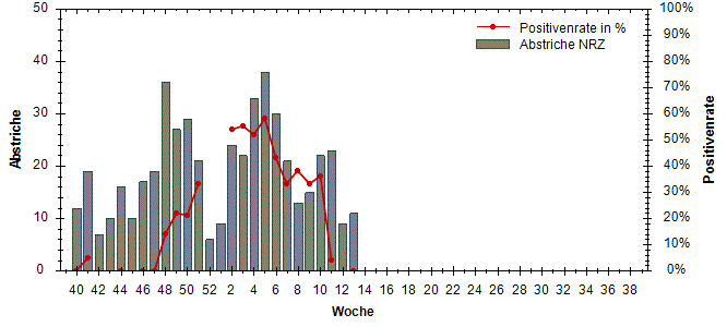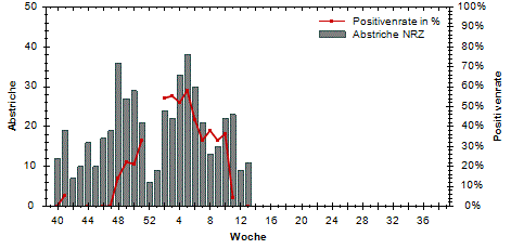 der Sentinelproben mit Erregernachweis (Positivenrate, rechte y-Achse) sowie die Anzahl der an das NRZ eingesandten Sentinelproben (linke y-Achse).