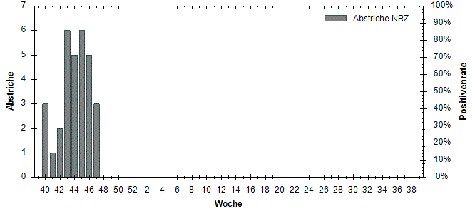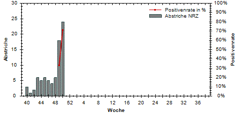 der Sentinelproben mit Erregernachweis (Positivenrate, rechte y-Achse) sowie die Anzahl der an das NRZ eingesandten Sentinelproben (linke y-Achse).